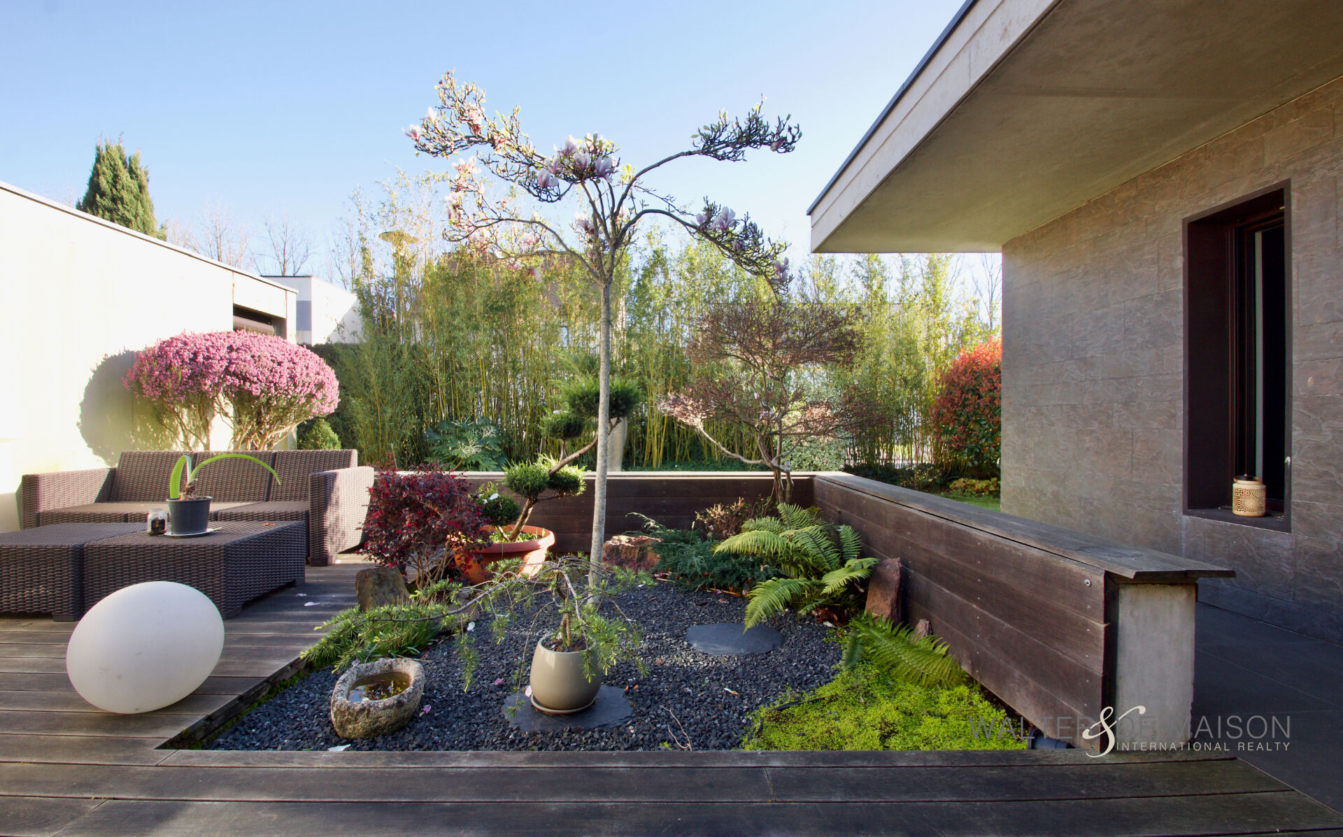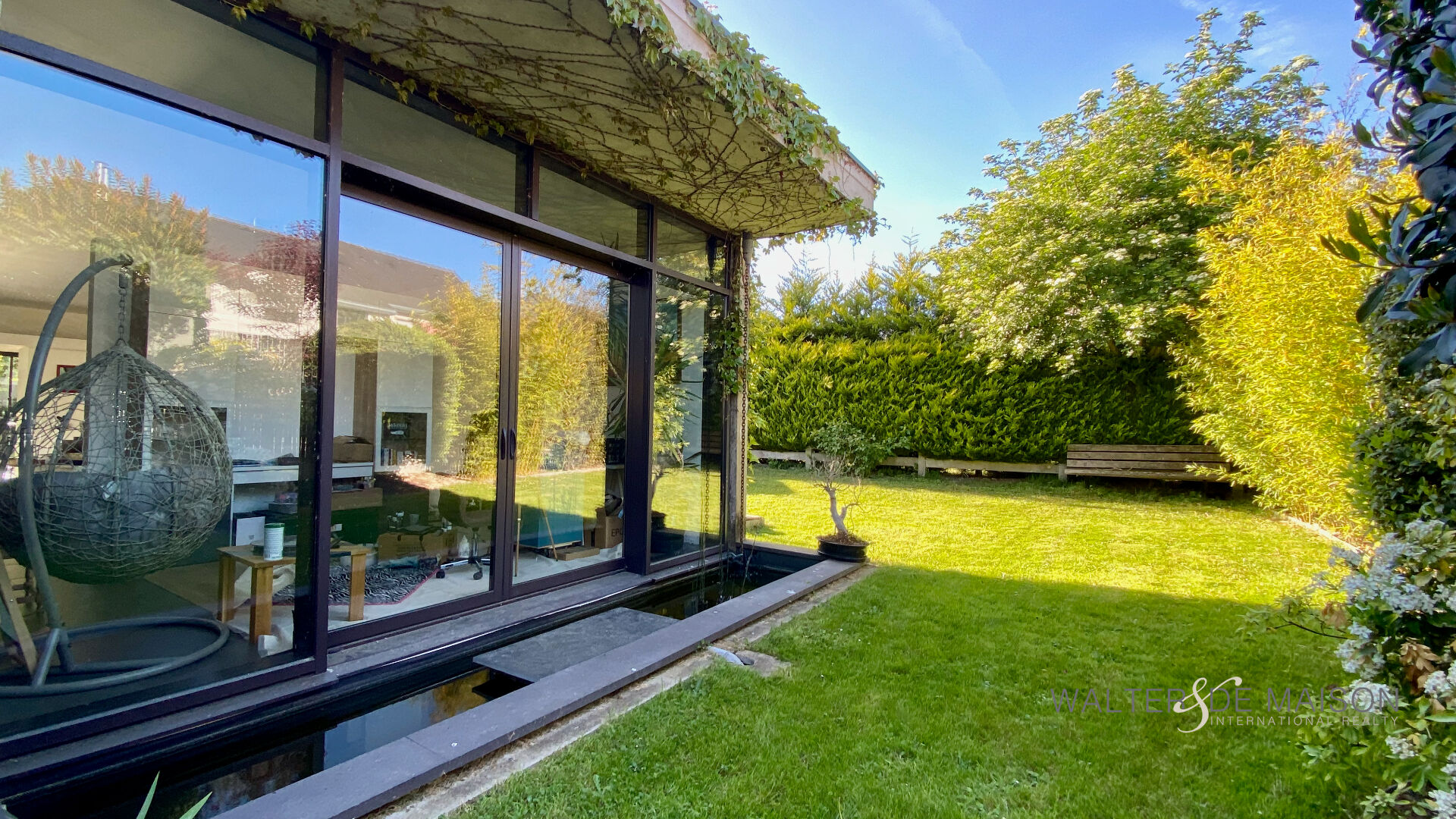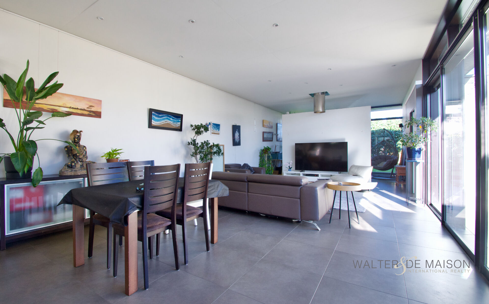 Un lieu de vie unique où l’architecture brute rencontre la douceur d’un jardin paysagé.