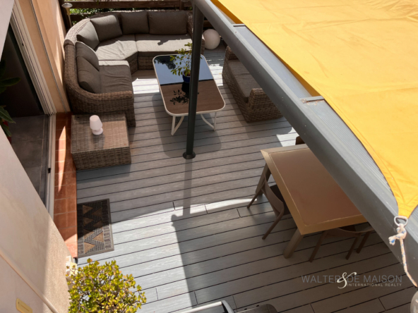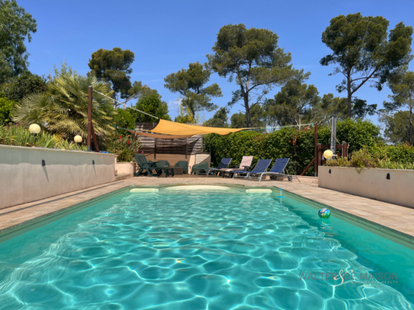 A l’extérieur, 1 600 m² de terrain paysager méditerranéen, une piscine au sel, trois terrasses aux expositions variées, un garage, deux abris voiture, et un accès au Canal de Provence.