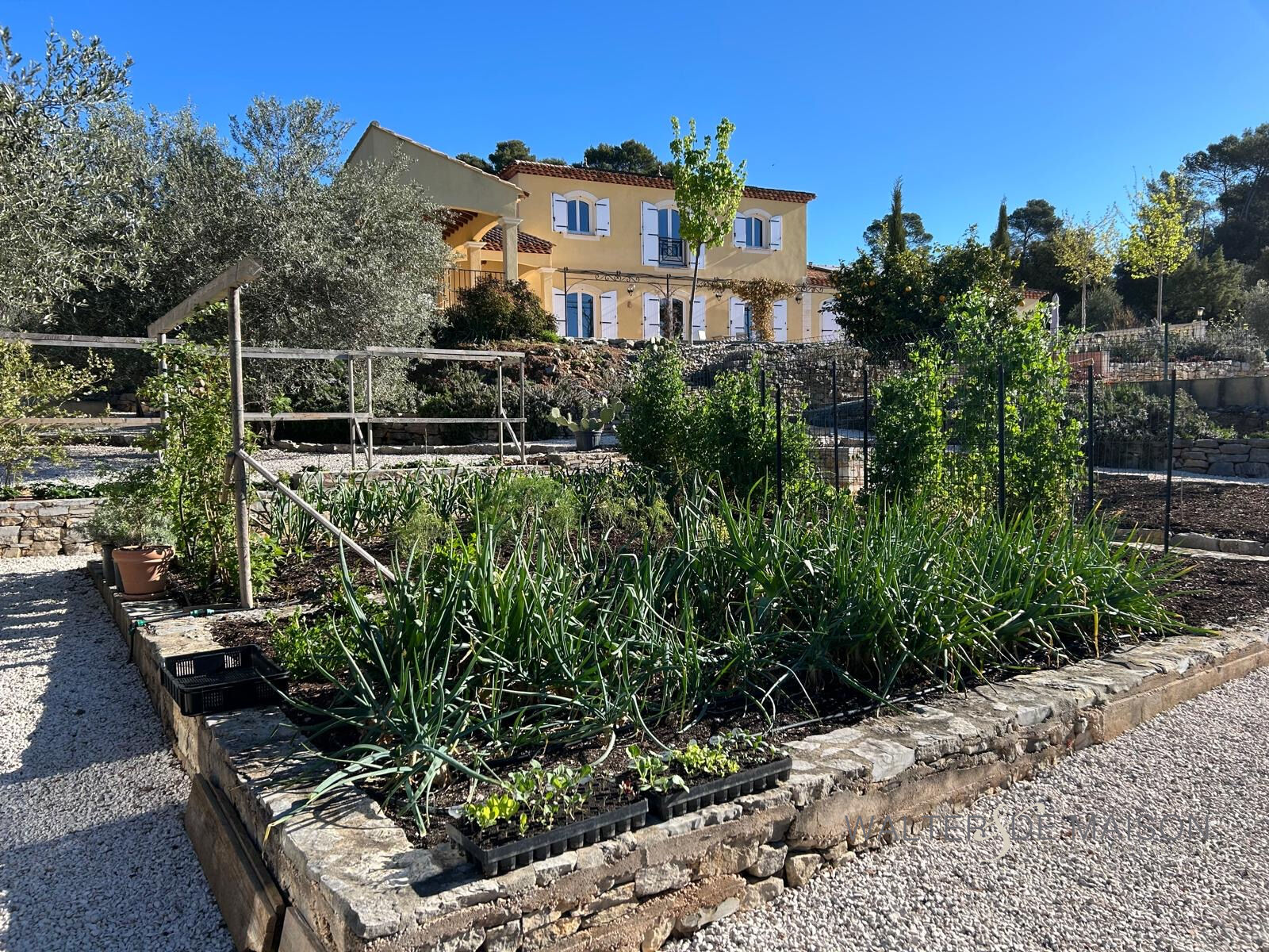 Érigée sur plus de 6 000 m² de terrain clos, la propriété bénéficie d’une vue dégagée sur les vignobles, dans un cadre sans vis-à-vis. Le jardin, sublimé par oliviers et essences méditerranéennes, comprend un potager, une serre chauffée et un puits, soulignant l’autonomie et l’authenticité de ce lieu.