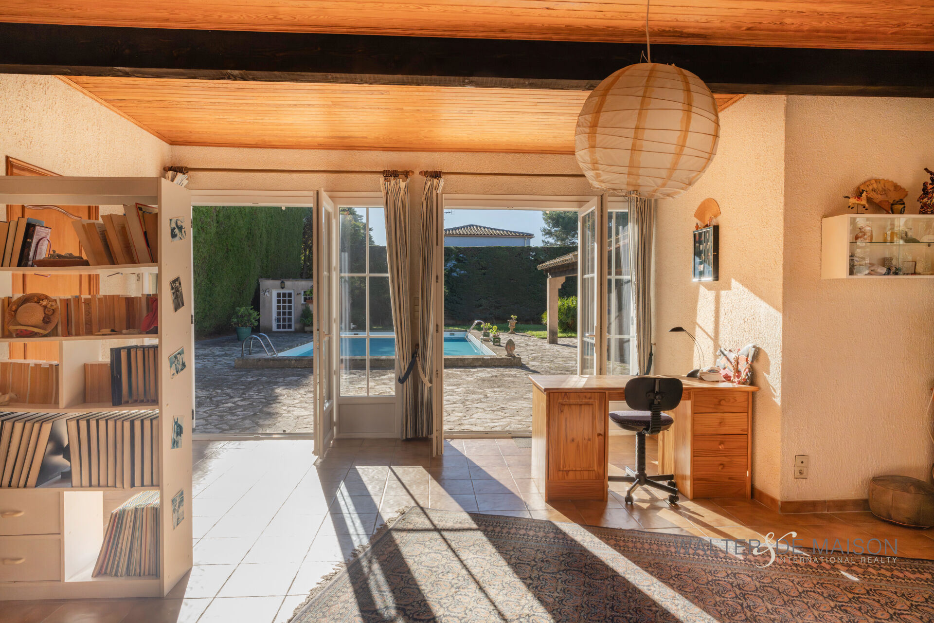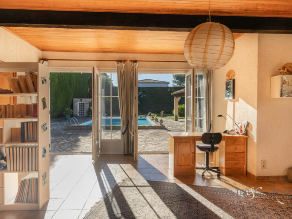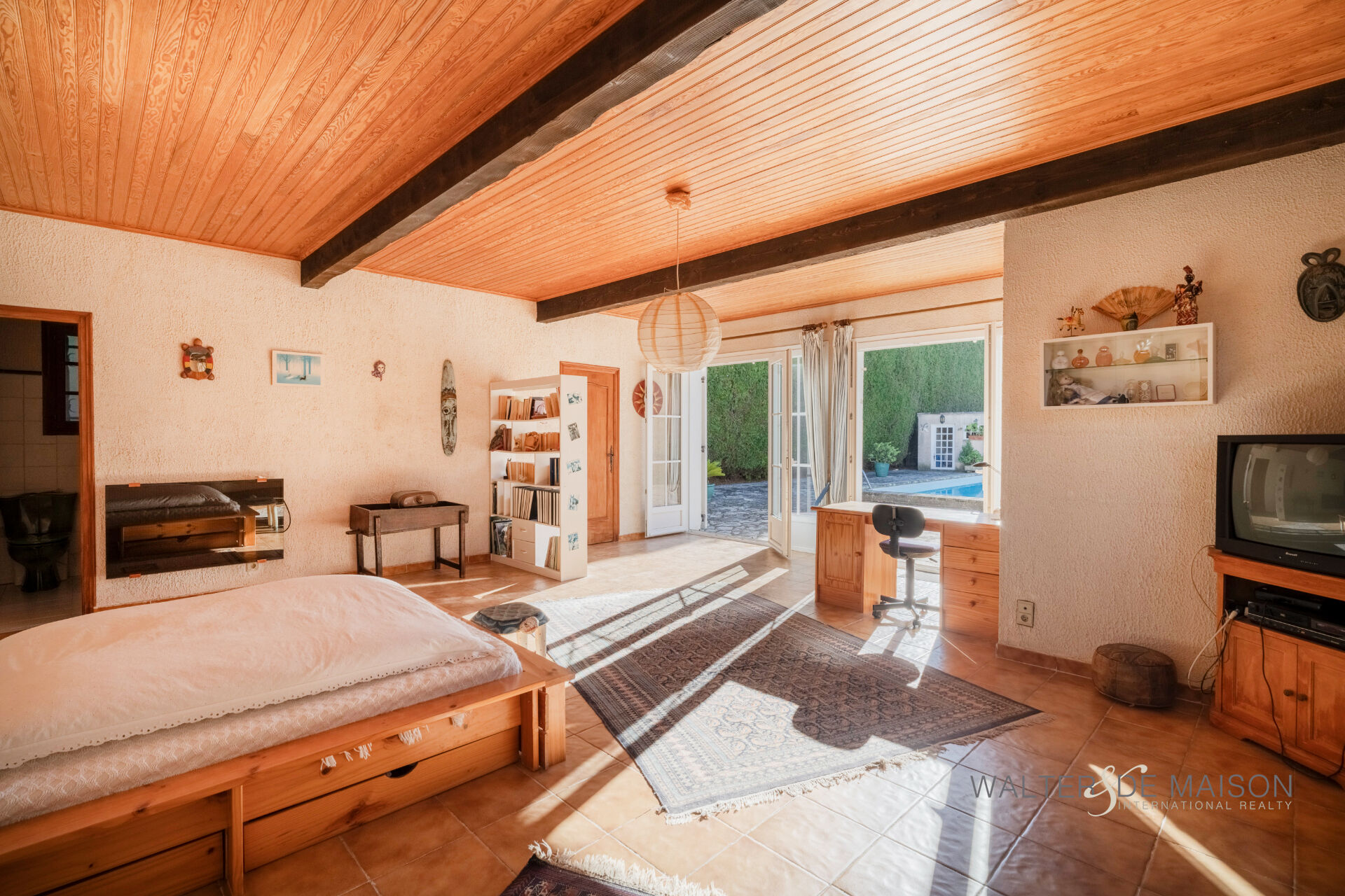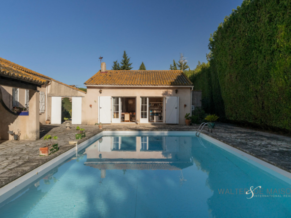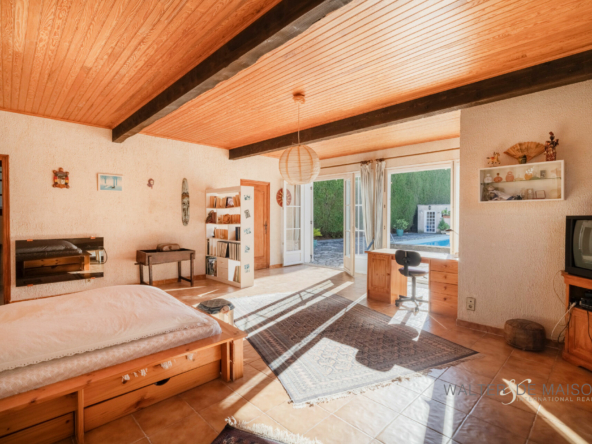 Cette maison très bien entretenu par le propriétaire se compose sur la partie principale d’un grand salon lumineux d’environ 50m² avec sa cheminée insert en pierre , d’une salle manger , d’une cuisine, de trois chambres et une salle de bain. Face à la piscine une dépendance ou maison d’ami de 70m² comprenant une grande pièce de vie et une salle de bain wc , possibilité de faire une cuisine pour en faire un studio pour une rentabilité locative à l’année pour le festival de la photo ou autre.