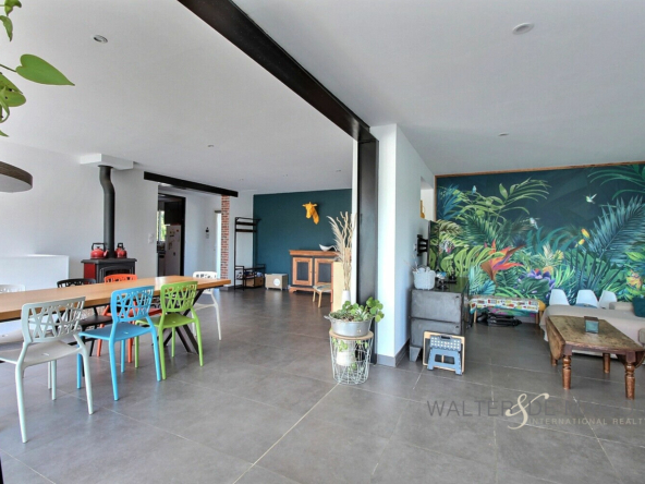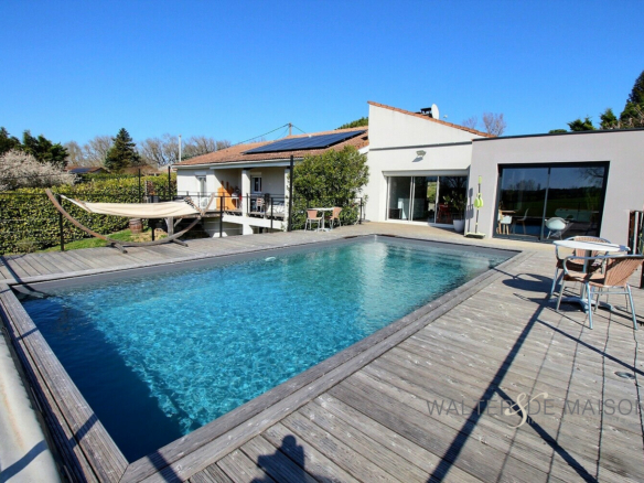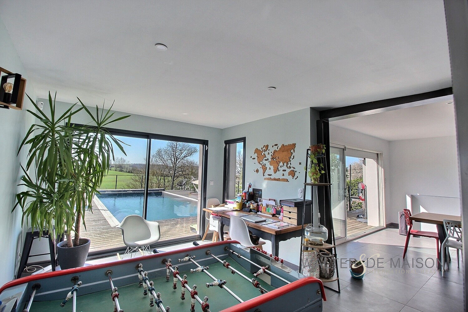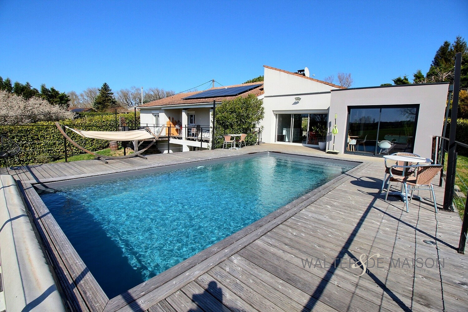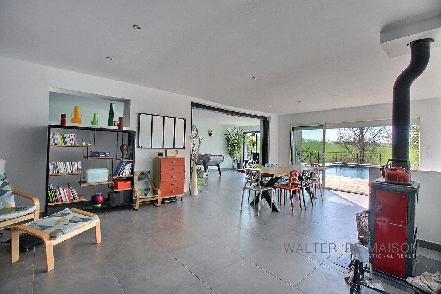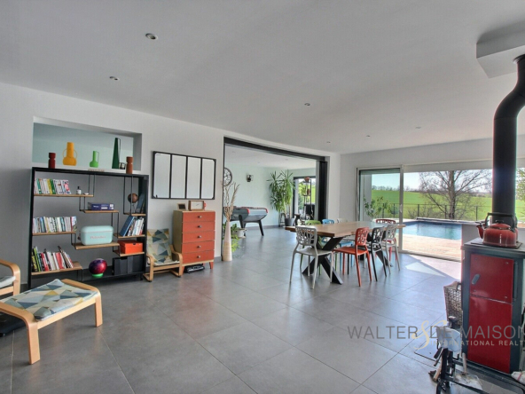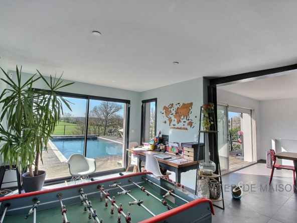 A 2 mn d’Ayguesvives sur la commune de Saint Léon : belle villa présentant 9 pièces principales pour une surface habitable d’environ 242 m2 dont 87m2 en REZ de jardin. Ensemble sis sur une parcelle de 3098 m2environ. La villa présente des espaces de réception vastes et chaleureux, exposés SUD-OUEST avec une vue panoramique sur la campagne. L’ensemble présente un très bon état général. Le bien bénéficie d’une bonne isolation thermique qui permet d’afficher un DPE C très satisfaisant. Le chauffage est assuré par un Climatisation réversible complétée par un poêle à bois performant. Cette habitation de caractère familial présente en RDC un séjour/salle à manger et un salon totalisant 66 m2, la cuisine ouverte mais distincte et indépendante des espaces salon et séjour. Toujours en RDC l’espace nuit comprend: 4 chambres, un W-C et une salle de bains. Une 5ème chambre et une deuxième salle de bains se trouvent dans le sous-sol aménagé qui ouvre sur le jardin. On y trouve également, une pièce de jeux, une salle de vidéo projection, et une salle de sport ou 6ème chambre selon usage. La piscine en accès direct depuis les pièces de vie bénéficie d’un traitement au sel. On apprécie la grande terrasse bois en continuité de la façade sud/ouest de la maison et tout autour de la piscine. La vue panoramique sur la campagne est très belle. Le bien ne souffre d’aucun vis-à-vis. Le plus des panneaux solaires dernière génération assurant une grande partie de la consommation électrique du foyer Pour tout complément d’information et /ou plus de photos: Contact Véronique David, agent commercial en immobilier, 06 84 62 08 27. Un projet d’achat ou de vente immobilière ? Je suis à votre disposition pour échanger, contactez-moi !